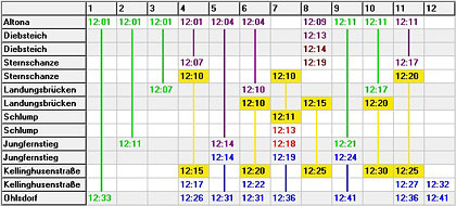 Im Beispiel oben ist in Spalte 11 zur Ankunft um 12:30 in "Kellinghusenstraße" die erste passende Abfahrtszeit 12:27 Uhr in Spalte 12 - erst in der nächsten Spalte (13) ist mit 12:32 Uhr die passende Zeit zu finden.
