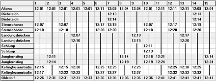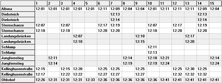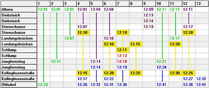 Im Beispiel oben ist in Spalte 9 die Ankunftszeit für die Station Sternschanze 12:19 Uhr. Die nächste Abfahrtszeit dazu ist 12:20 Uhr und steht in Spalte 12.