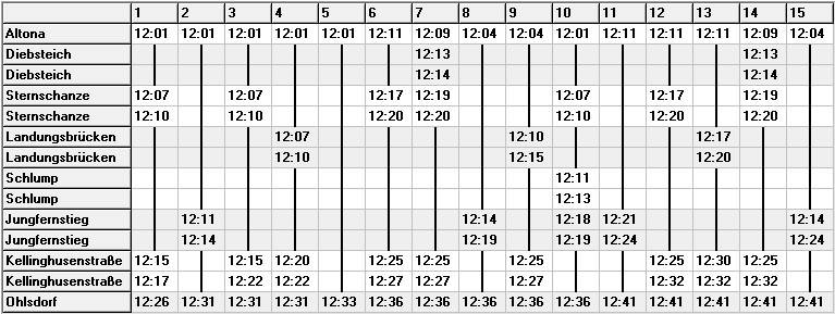 Im Beispiel oben ist in Spalte 8 die Ankunftszeit für die Station "Sternschanze" 12:19 Uhr. Die Abfahrtszeit für die Station Landungsbrücken in der gleichen Spalte ist 12:15 Uhr. Zwischen den beiden Zeiten befindet sich ein Lücke. Die nächste passende Abfahrtszeit für die Station "Sternschanze" ist 12:20 Uhr und befindet sich in Spalte 11. In diesem Beispiel werden statt zuvor 13 nur noch 12 Spalten benötigt.