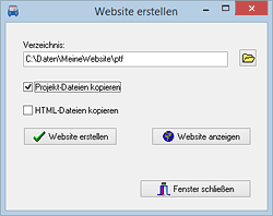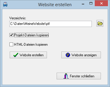 Sie können zum Kopieren auch das PTraffic-Programm verwenden. Laden Sie das Projekt und wählen Sie den Menüpunkt "Projekt → Website erstellen". Im Fenster "Website erstellen" wählen Sie nun das Unterverzeichnis "ptf" aus und deaktivieren "HTML Dateien kopieren" (siehe Bild). Klicken Sie dann auf "Website erstellen". Allerdings wird dabei automatisch im Verzeichnis "ptf" ein Unterverzeichnis "images" erstellt. Dort werden - soweit vorhanden - die Bilder der Liniennetzpläne kopiert. Wenn Sie die Liniennetzpläne für Ihre Anwendung benötigen können Sie diese in das eigene Verzeichnis "images" (siehe oben) kopieren und das Unterverzeichnis "images" im Verzeichnis "ptf" anschließend löschen.